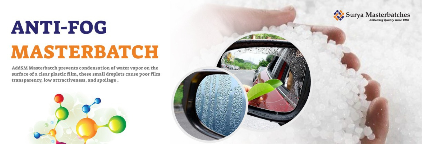 Surya Masterbatches (P) LTD is a Leading Manufacturer and supplier of Anti-Fog Masterbatch in Delhi, India. AddSM Anti-Fog Masterbatch prevents condensation of water vapor on the surface of a clear plastic film, these small droplets cause poor film transparency, low attractiveness, and spoilage of packaged foods. This masterbatch is best for Packaging of Food Items as it permits Perfect Transparency, doesn’t let Food Quality to deteriorate for Longer Time and is useful in eliminating Hot & Cold Fog.