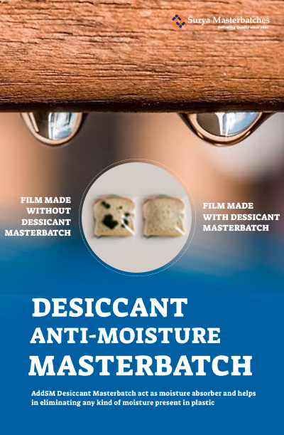 Raw Materials such as polymers, fillers and pigments used in plastic production usually gain moisture over transportation & storage due to their Hygroscopic nature. When added to main compound or product, AddSM Desiccant Masterbatch act as moisture absorber and helps in eliminating any kind of moisture present in plastic. Desiccant Masterbatches will minimize the need for pre-drying of materials and expand control of critical polymers for processing moisture.