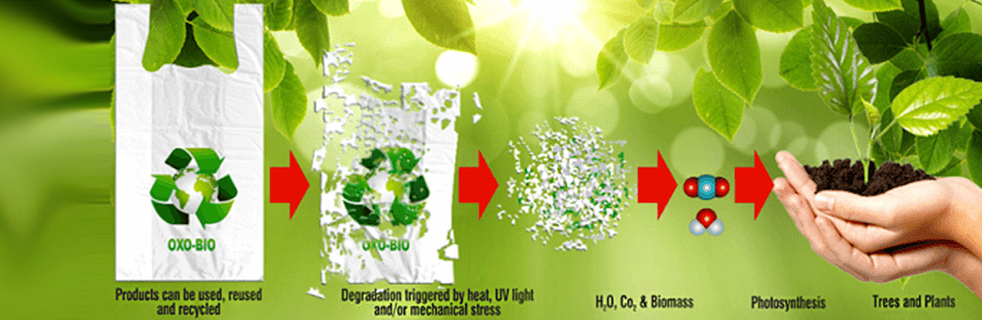 Surya Masterbatches offers unique Oxo-Biodegradable solutions for serving such purpose. The addition of the Oxo-Biodegradable Masterbatch to polyolefin promotes the degradation in presence of UV/Sunlight & Oxygen. The life of the polyolefin products can be controlled by increasing or decreasing the percentage of the masterbatch in to the plastic material. Oxo biodegradable plastics completely degrades into CO2,water and Biomass leaving no polymeric behind.